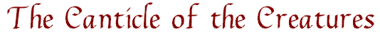 Most High, all-powerful, good Lord, all praise is yours, all glory, all honor, and all blessing. To you, alone, Most High, do they belong. No mortal lips are worthy to pronounce your name. All praise be yours, my Lord, through all you have made, and first my lord Brother Sun, who brings the day; and through whom you give us light. How beautiful is he, how radiant in all his splendor; Of you, Most High, he bears the likeness. All Praise be yours, my Lord, through Sister Moon and the stars; in the heavens you have made them, bright, and precious, and fair. All praise be yours, my Lord, through Brothers wind and air, and fair and stormy, all the weather's moods, by which you cherish all that you have made. All praise be yours, my Lord, through Sister Water, so useful, humble, precious and pure. All praise be yours, my Lord, through Brother Fire, through whom you brighten up the night. How beautiful is he, how cheerful! Full of power and strength. All praise be yours, my Lord, through our Sister Mother Earth, who sustains us and governs us, and produces various fruits with colored flowers and herbs. All praise be yours, my Lord, through those who grant pardon for love of you; through those who endure sickness and trial. Happy are those who endure in peace, By You, Most High, they will be crowned. All praise be yours, my Lord, through Sister Death, From whose embrace no mortal can escape. Woe to those who die in mortal sin! Happy those she finds doing your will! The second death can do them no harm. Praise and bless my Lord, and give him thanks And serve him with great humility.